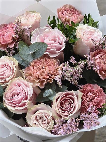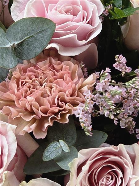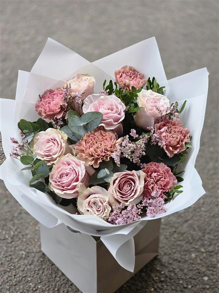 Featuring premium pink roses paired with delicate ruffled carnations, textured seasonal accents and fresh eucalyptus foliage for a natural, balanced finish.