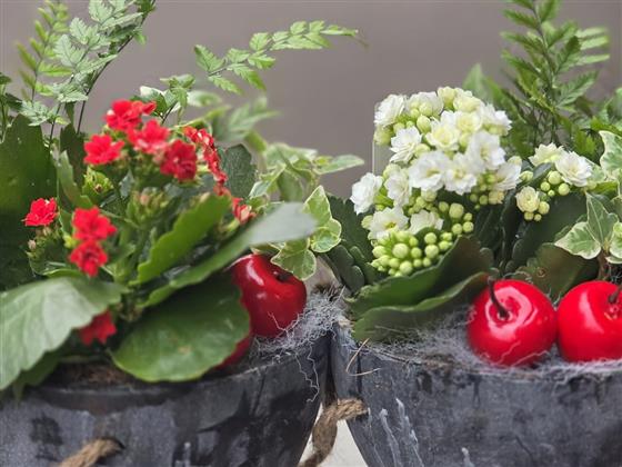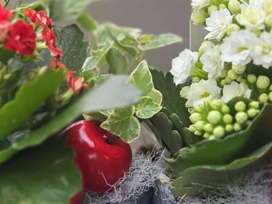 A beautiful Christmas plant bowl with mixed foliage and a seasonal flowering plant.