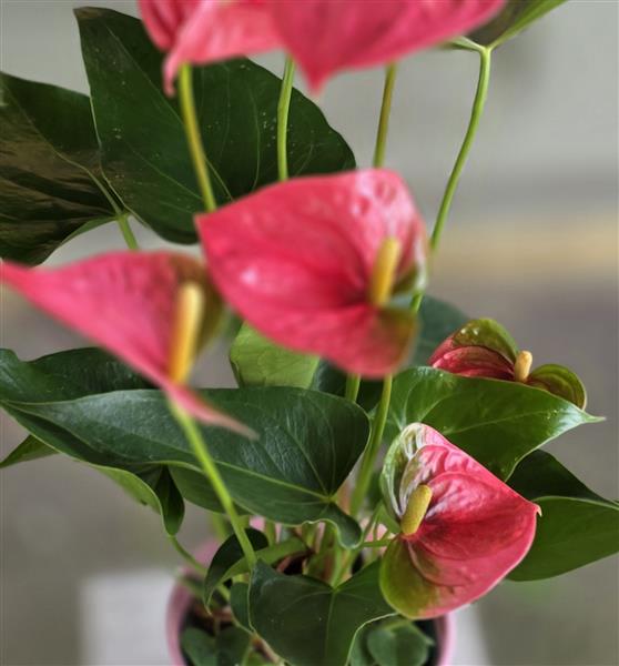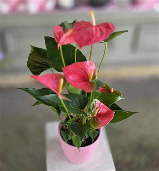 Pink anthurium plant with pot. Around 40cm tall